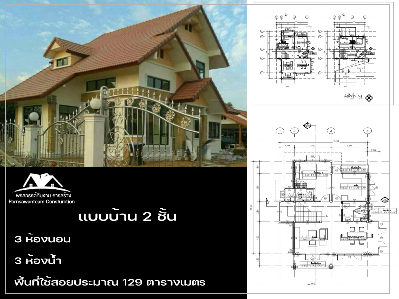 บ้าน 2 ชั้น 3 ห้องนอน 3 ห้องน้ำ พื้นที่ใช้สอยประมาณ 129 ตารางเมตร